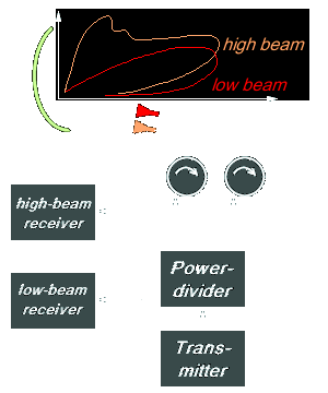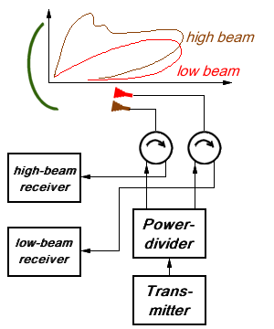 | The picture shows how the power is fed to the two feed horns. In practice the majority of the power is fed to the low beam in order to achieve the long range performance. A power divider is used to split the power between the two horns. The signal received by the two horns are processed separately thereby achieving detection in one horn even if the alternative horn does not provide coverage. | ![]() ![]() Picture: Radarantenna with high- and low- beam pattern |