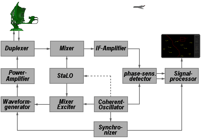 The block diagram on the figure illustrates the principle of a fully coherent radar. The fundamental feature is that all signals are derived at low level and the output device serves only as an amplifier. All the signals are generated by one master timing source, usually a synthesiser, which provides the optimum phase coherence for the whole system. The output device would typically be a klystron, TWT or solid state. Fully coherent radars exhibit none of the drawbacks of the pseudo-coherent radars, which we studied in the previous section. DuplexerThe duplexer alternately switches the antenna between the transmitter and receiver so that only one antenna need be used. This switching is necessary because the high-power pulses of the transmitter would destroy the receiver if energy were allowed to enter the receiver. Mixer StageThe function of the mixer stage is to convert the received rf energy to a lower, intermediate frequency (IF) that is easier to amplify and manipulate electronically. The intermediate frequency is usually 30 or 60 megahertz. It is obtained by heterodyning the received signal with a local-oscillator signal in the mixer stage. The mixer stage converts the received signal to the lower IF signal without distorting the data on the received signal. IF-AmplifierAfter conversion to the intermediate frequency, the signal is amplified in several IF-amplifier stages. Most of the gain of the receiver is developed in the IF-amplifier stages. The overall bandwidth of the receiver is often determined by the bandwidth of the IF-stages. Power AmplifierIn this system the transmitting pulse is caused with a small performance in a waveform generator. It is taken to the necessary power with a Power Amplifier following. The Power Amplifier would typically be a klystron, Travelling Wave Tube (TWT) or solid state. Stable Local Oscillator (StaLO)The StaLO is also very stable CW RF oscillator, which generates the local RF frequency simultaneously for up-conversion in the transmitter and down-conversion in the receiver. Minimum FM noise (or phase noise) of the StaLO is an important characteristic. This is because such noise would limit the overall MTI improvement factor, as fixed clutter would inherit a Doppler component from the transmission. Similar arguments apply to FM noise added by the output device. Coherent OscillatorThe COHO is a very stable CW (Continuous Wave) oscillator locked to the IF frequency (The COHO frequency is generally derived from a master crystal oscillator) and constitutes the internal phase reference. The COHO provides the coherent reference signal to the Phase Sensitive Detector and also through a frequency divider generates the system PRF in the Synchronizer. Mixer / ExciterThe function of this mixer stage is to convert the StaLO- Frequency and the COHO- Frequency upwards into the phase-stabile continuous wave transmitter-frequency. Phase Sensitive DetectorThe IF-signal is passed to a phase sensitive detector which converts the signal to base band, while faithfully retaining the full phase and quadrature information (I & Q- processing) of the Doppler signal. Radarscope / MonitorThe indicator presents to the observer a continuous, easily understandable, graphic picture of the position of radar targets. In recently radars the indicator would be a computer display.